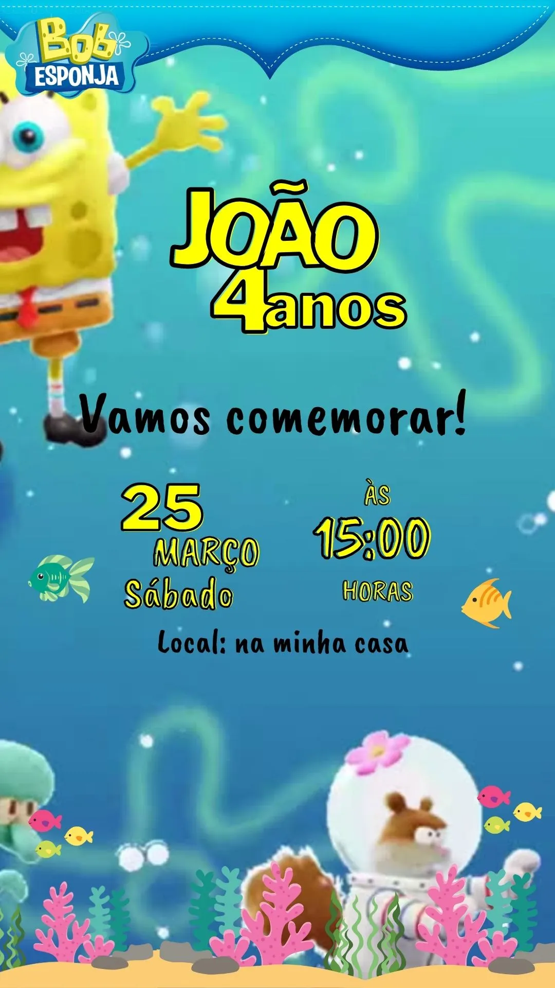 Convite Virtual Animado Bob Esponja em MP4, personalizado com dados da festa. Compartilhe pelo WhatsApp e encante seus convidados com diversão.